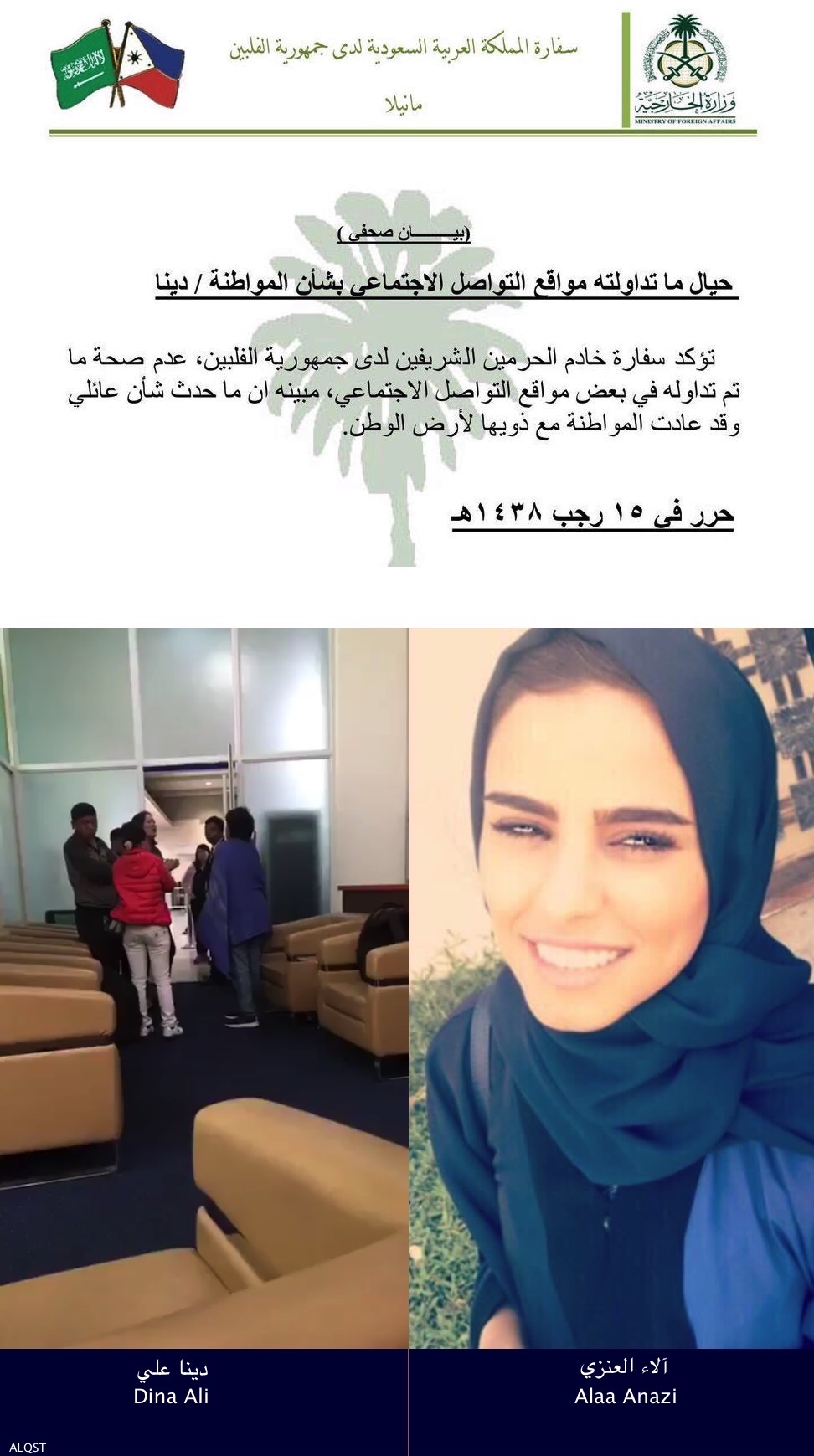 في العاشر من أبريل الجاري ظهرت المواطنة السعودية دينا علي السلوم اليامي في مقطع فيديو تقول فيه أنها هربت من السعودية طالبة اللجوء في استراليا، وأضافت أنه خلال توقف رحلتها في الفلبين تم احتجازها لمدة 13 ساعة من قبل السلطات الفلبينية بطلب من السفارة السعودية، وطلبت خلال الفيديو المسجل حمايتها وضمان سلامتها.