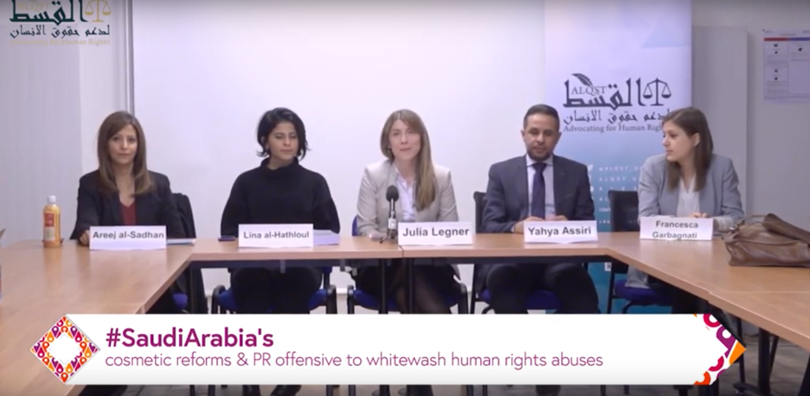 في 4 مارس 2020، عقدت القسط مع الفدرالية الدولية لحقوق الإنسان ومؤسسة رايت لايفليهود ندوة في مجلس حقوق الإنسان التابع للأمم المتحدة بعنوان: "الإصلاحات الشكلية والحملة الدعائية لتلميع انتهاكات لحقوق الإنسان". تحدث في الندوة أحد النواب في البرلمان الأوروبي واثنتان من أسر الضحايا، وسلطوا الضوء على التباين بين صورة الإصلاح التي تحاول السلطات السعودية تقديمها عن نفسها والوضع المزري لحقوق الإنسان على أرض الواقع، ودعت الندوة المجتمع الدولي لزيادة الجهود لمحاربة الإفلات من العقوبة في السعودية.
