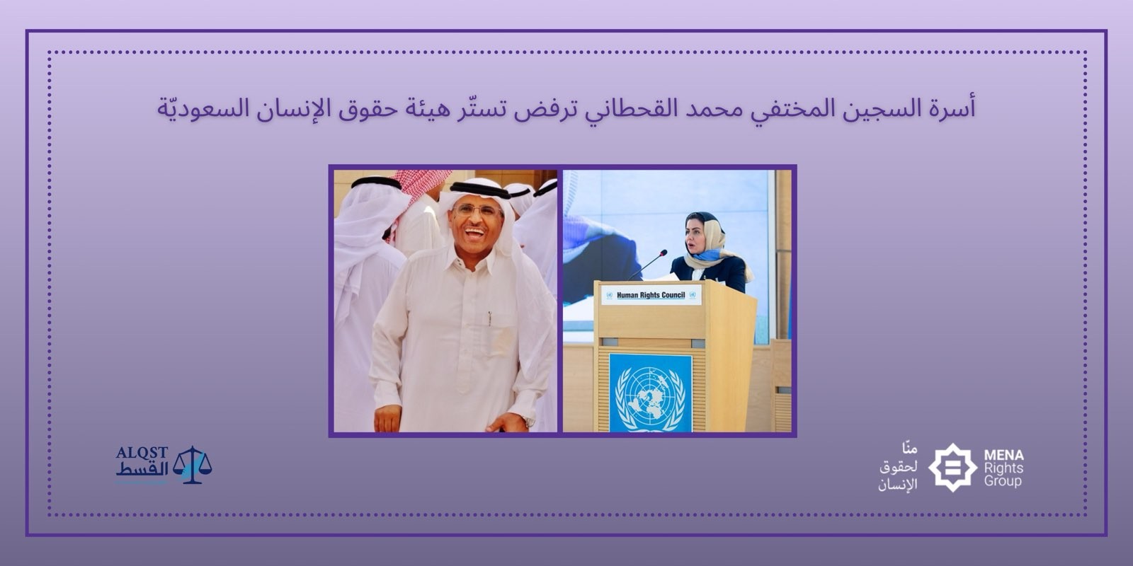 أصدرت زوجة المدافع السعودي البارز عن حقوق الإنسان محمد القحطاني بيانًا ينفي بشكل قاطع ادعاء مسؤول سعودي بأنّ القحطاني كان على اتصال مؤخرًا بأسرته، واتّهمت هيئة حقوق الإنسان السعوديّة المدعومة من الدولة بالتستر على الانتهاكات التي ترتكبها السلطات، بما في ذلك اختفاء القحطاني المستمر. وترى القسط ومنَا لحقوق الإنسان أن هذا التستر نموذجي لدور هيئة حقوق الإنسان السعوديّة في تبييض سجل السلطات السعوديّة الصارخ في مجال حقوق الإنسان، وتدعوان إلى وضع حد لهذه الممارسة التعسّفية.