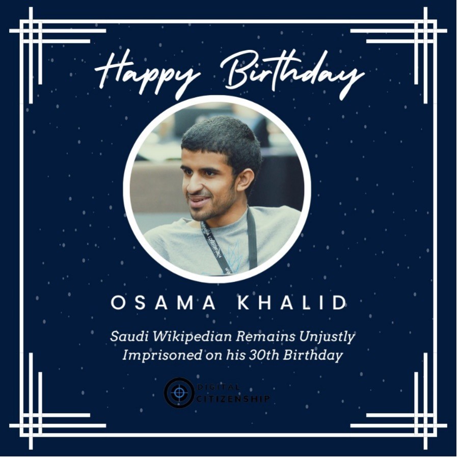 بتاريخ 19 يناير 2024، يخيم الظل على الذكرى الثلاثين لميلاد أسامة خالد، طبيب الأطفال السعودي والمدون والويكيبيدي البارز. بدلاً من الاحتفال مع عائلته وأحبائه، أنه يحتفل بهذا اليوم وهو محبوس في زنزانة السجن للعقود الثلاثة المقبلة.