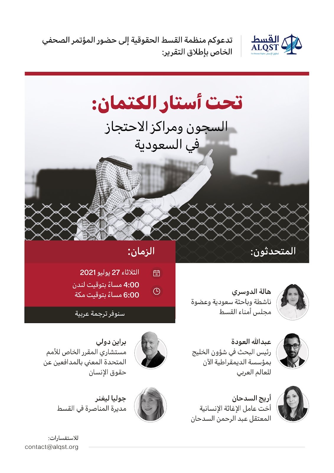 في 27 يوليو 2021، عقدت القسط ندوة بعنوان "تحت أستار الكتمان: السجون ومراكز الاحتجاز في السعودية" حول إطلاق تقرير القسط الأخير عن نظام السجون في السعودية.